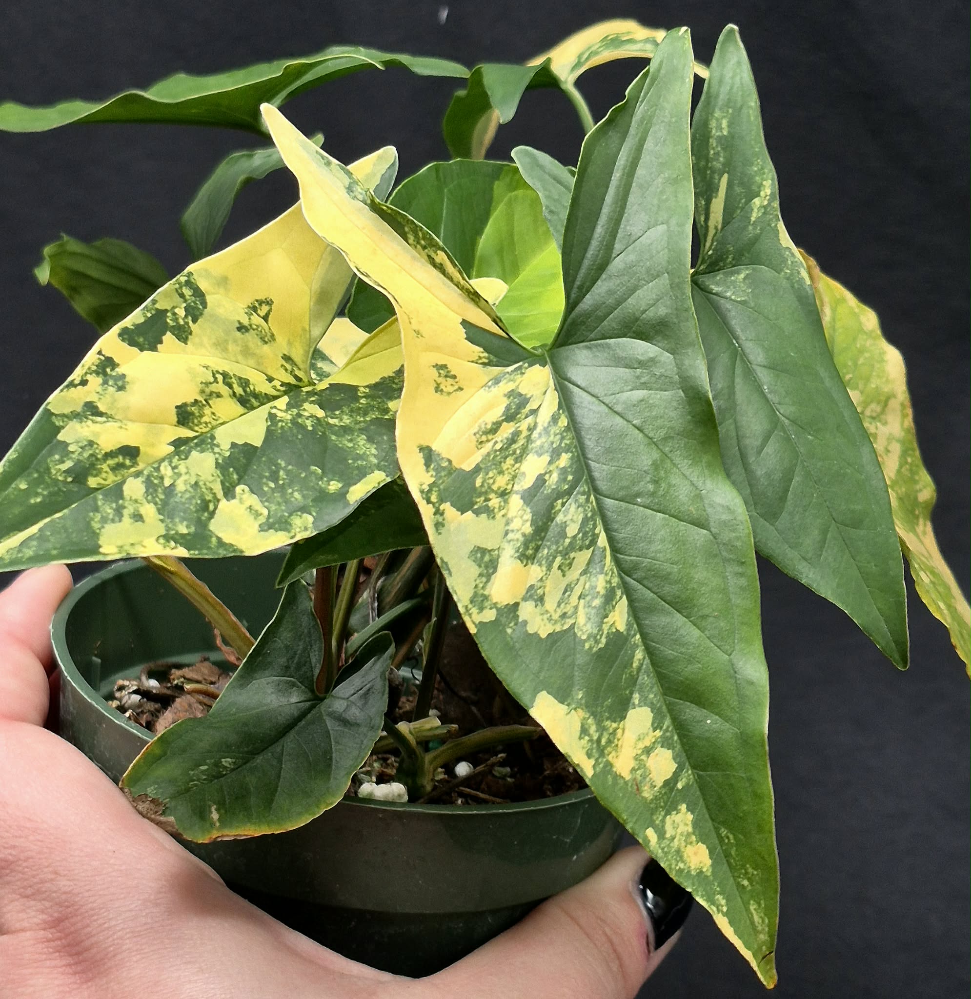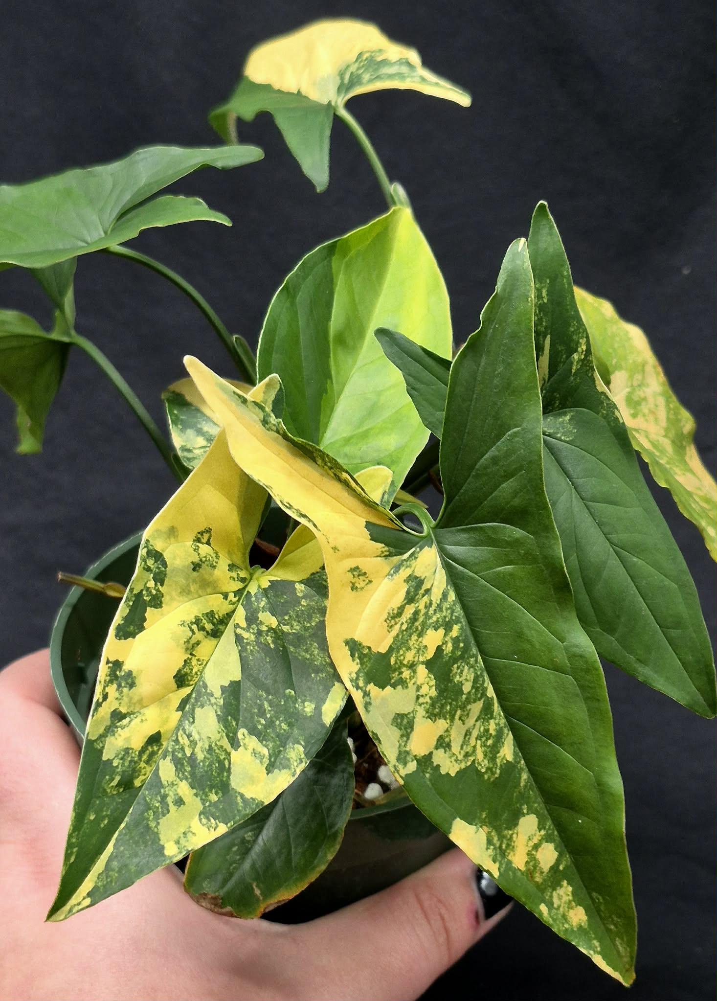 Syngonium are some of the most hardy houseplants around and are a great choice for beginners and experienced growers alike. They are readily grown in a wide variety of conditions, from bright indirect light to bathrooms with one window. Water this plant when it is about 50-75% dry.